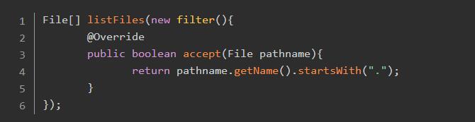 File[] listFiles(FileFilter filter) { // 实现过滤逻辑的核心代码段}